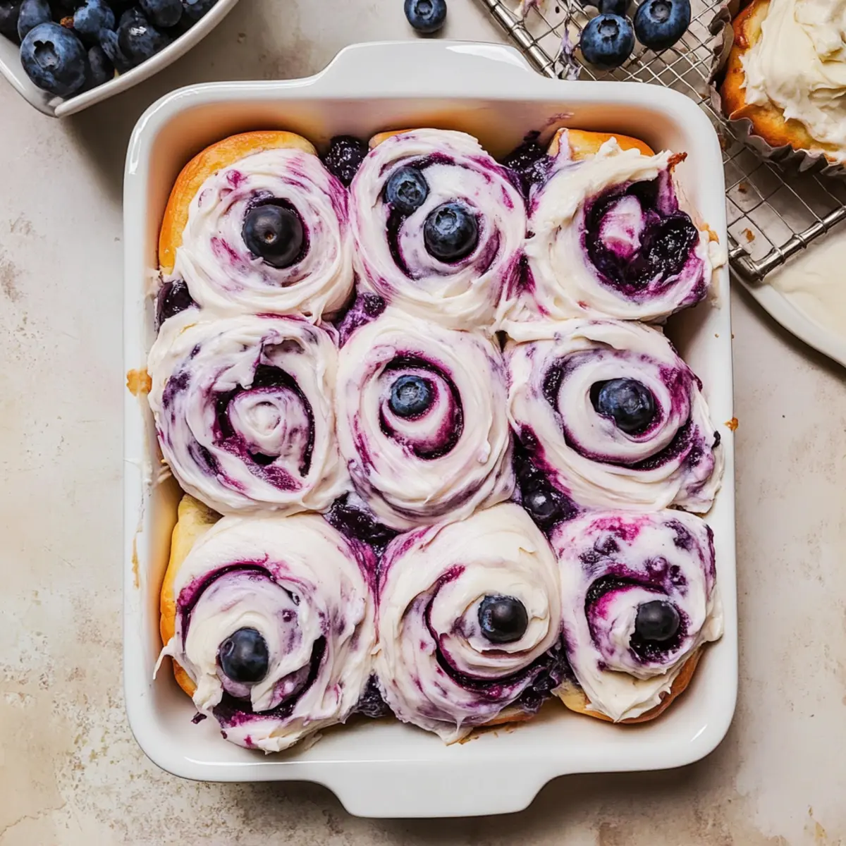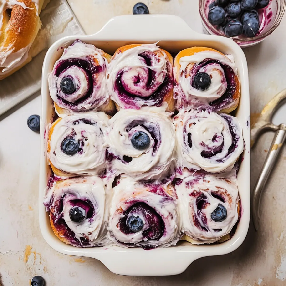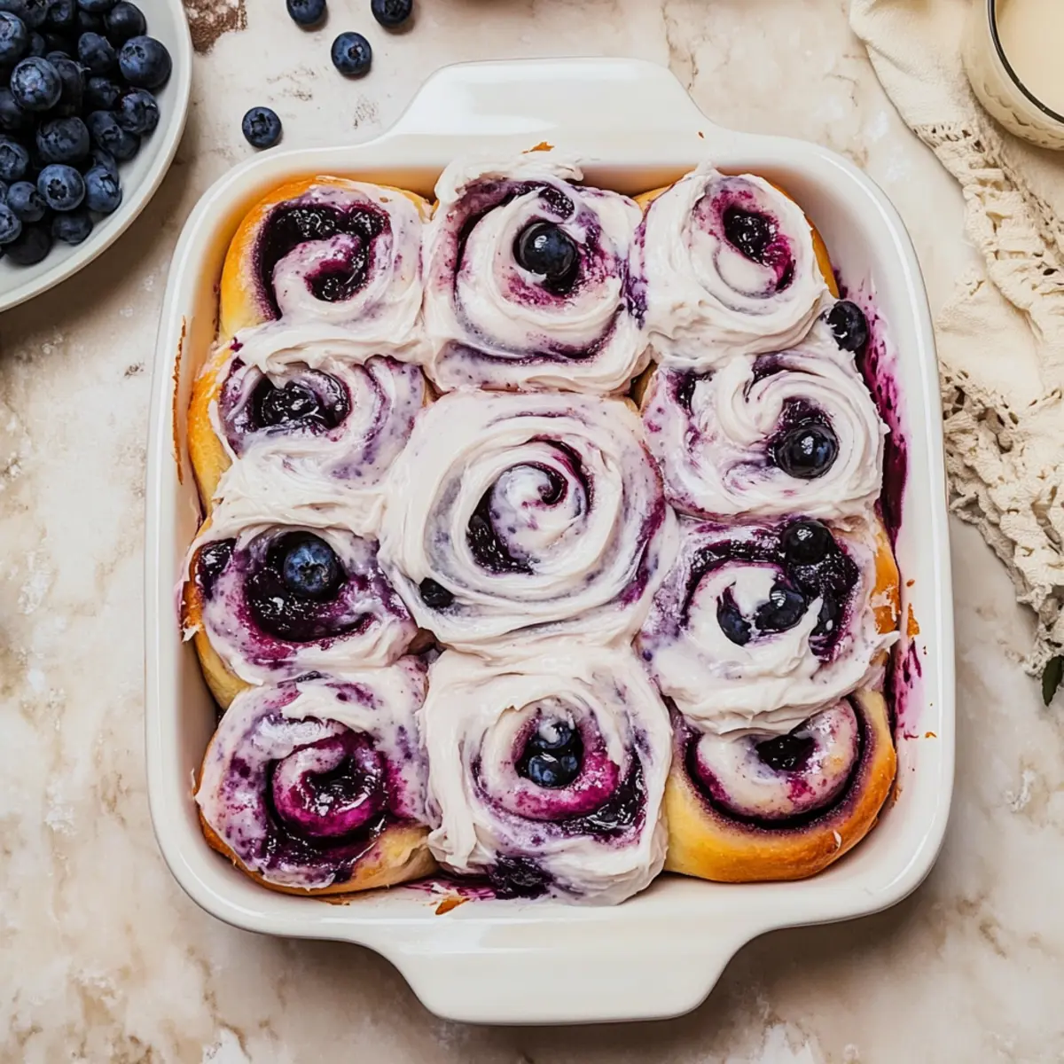 After baking, let the rolls cool in the pan for about 10 minutes. Meanwhile, prepare your cream cheese frosting by blending softened cream cheese, sifted powdered sugar, reserved blueberry jam, and a splash of vanilla extract until smooth. Once the rolls have slightly cooled, drizzle or spread the frosting over them to create a luscious finishing touch for your Blueberry Cinnamon Rolls.