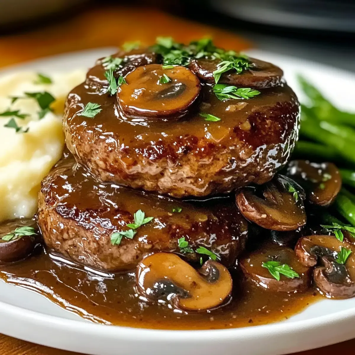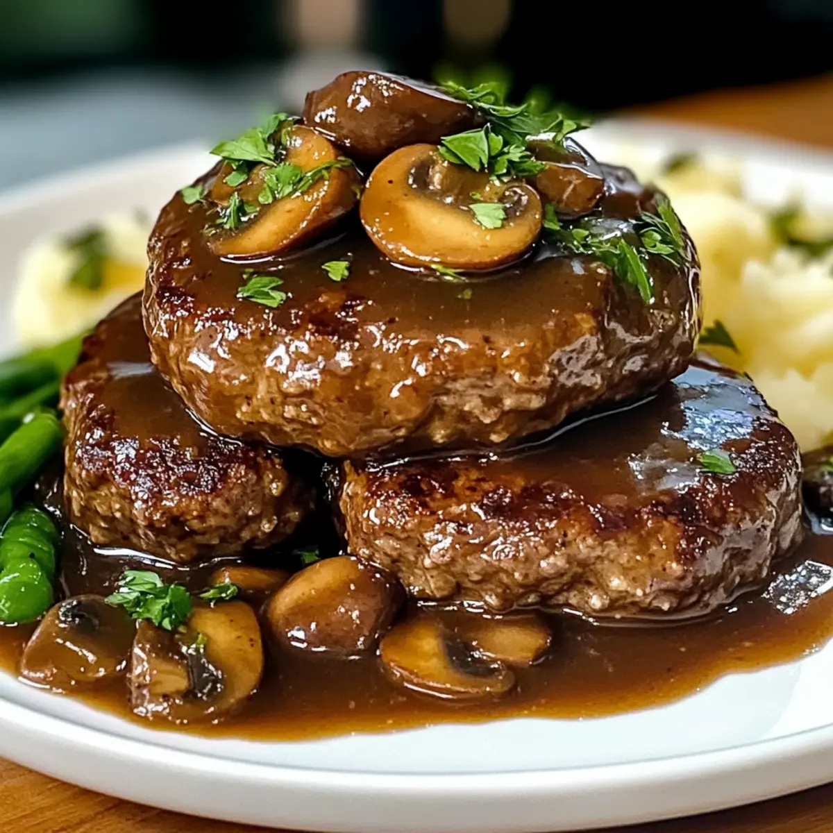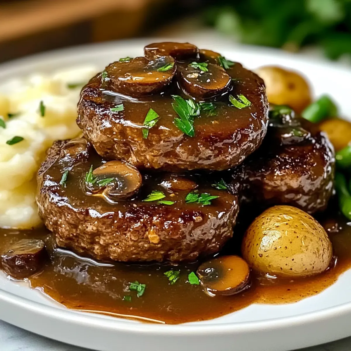 Carefully plate the Salisbury steaks, drizzling the rich mushroom gravy over the top. Pair this hearty dish with sides such as creamy mashed potatoes or steamed vegetables for a balanced meal. The visual appeal of the gravy-coasted patties should evoke warmth and comfort, perfect for sharing with loved ones.