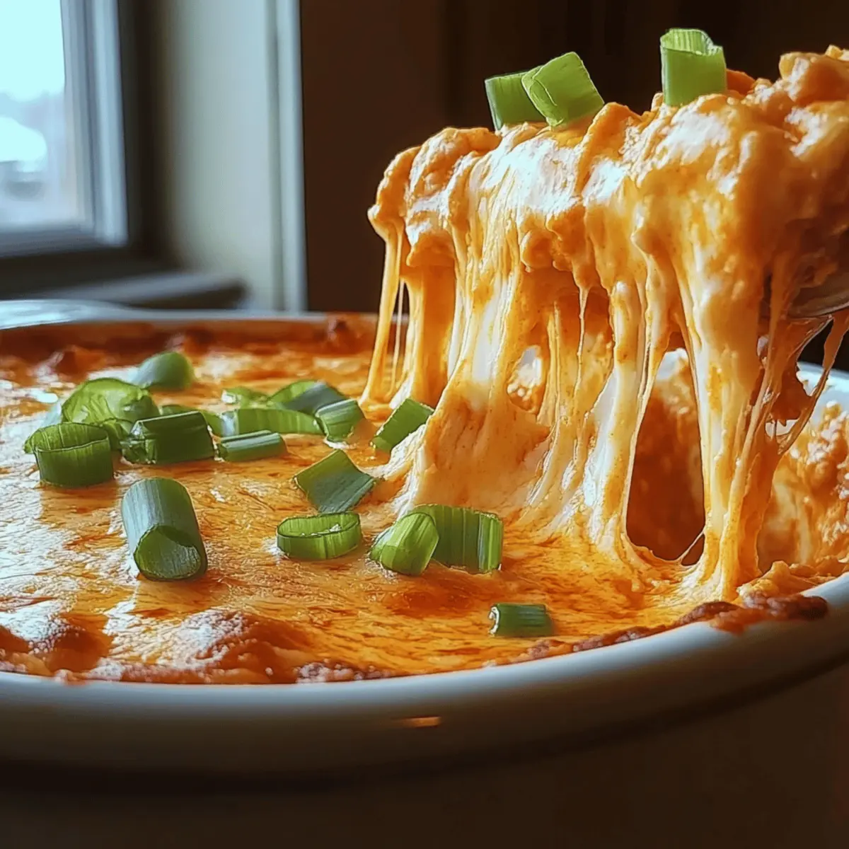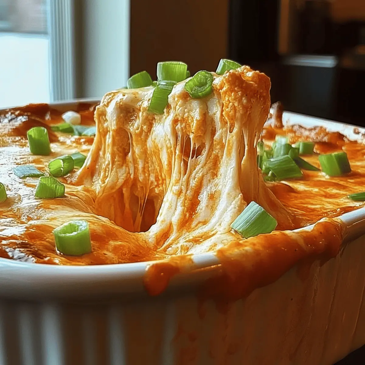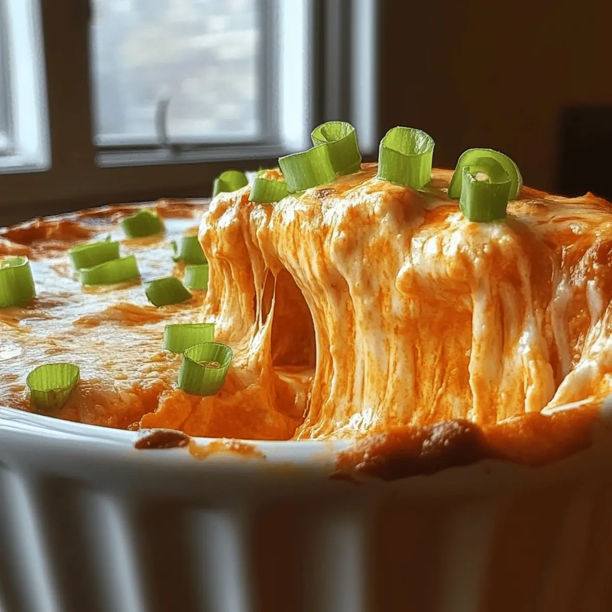 Once baked, carefully remove the Buffalo Chicken Dip from the oven and let it cool for about 5 minutes. This brief cooling period allows the dip to set a little, making it easier to scoop. Just before serving, sprinkle with chopped green onions for an added pop of color and freshness, enhancing the overall presentation.