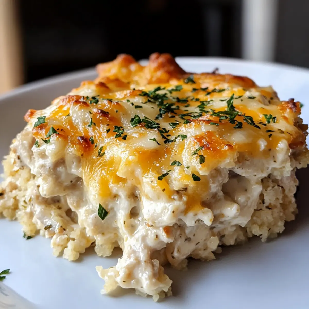 Enjoy a healthier twist on comfort food with this Cheesy Chicken Riced Cauliflower Casserole, perfect for family gatherings.