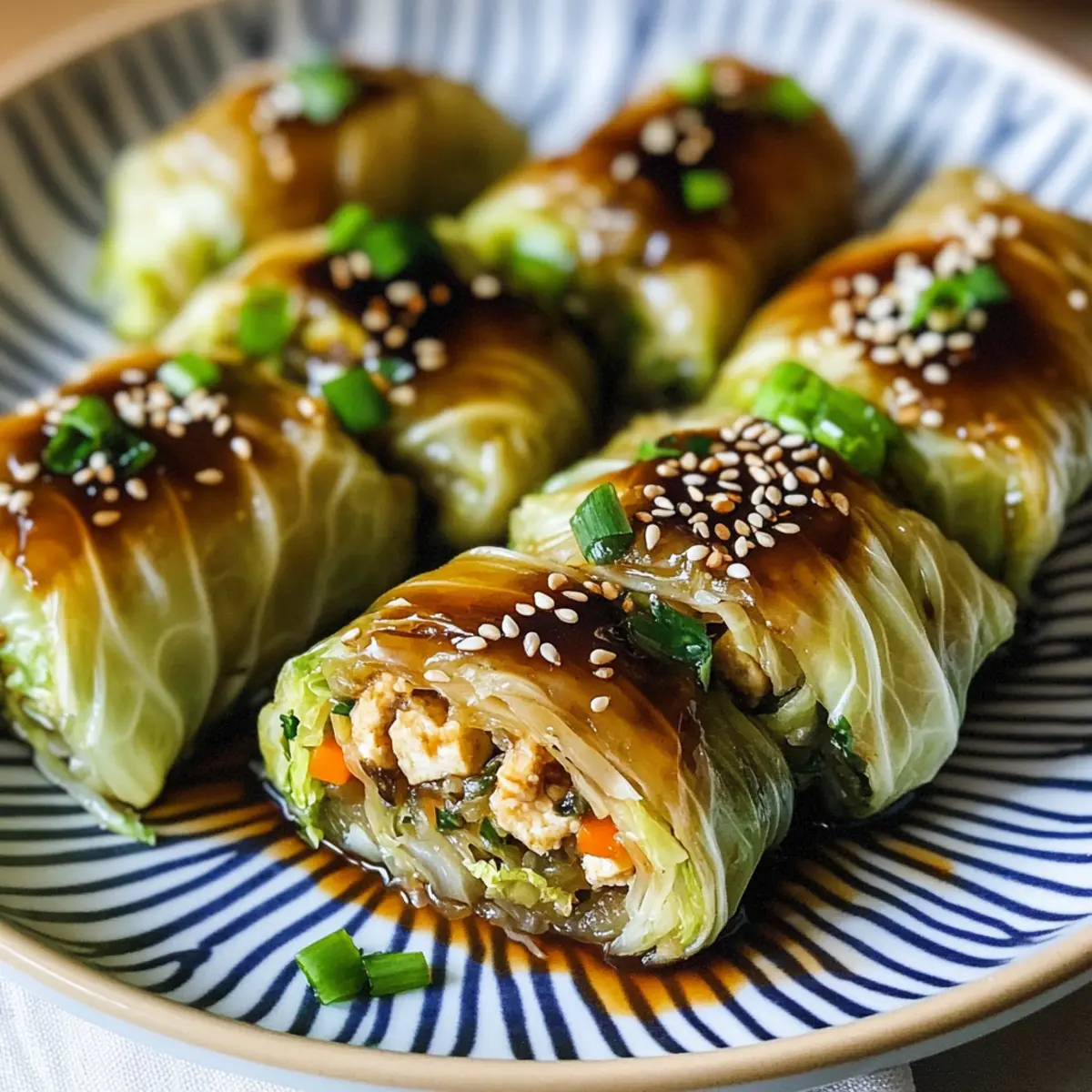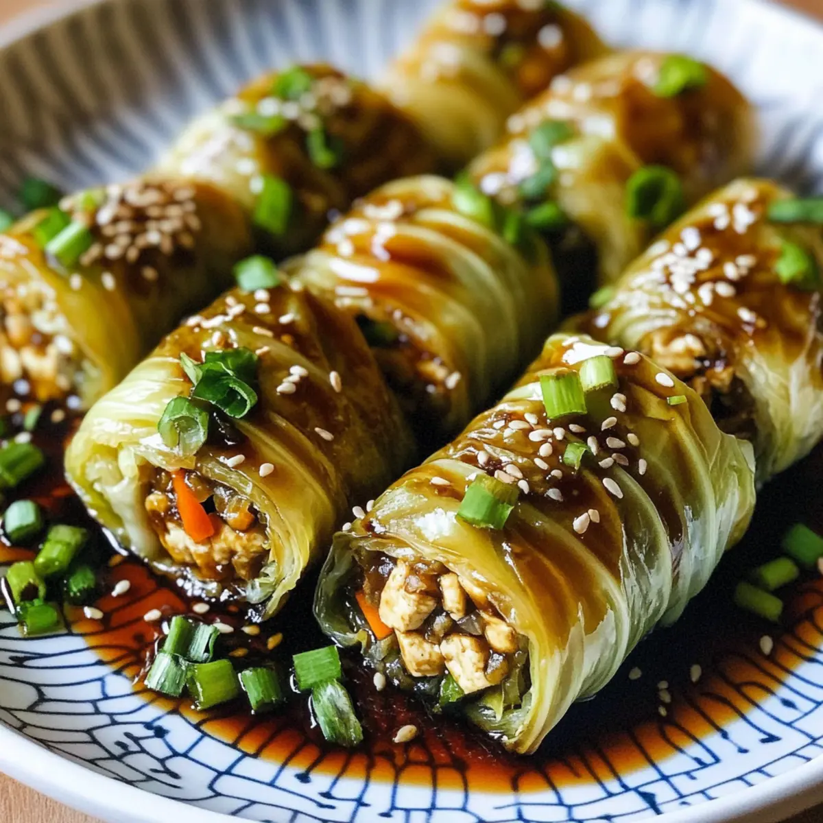 To serve, plate the crispy cabbage rolls and generously drizzle the savory sauce over them. Finish by garnishing with sesame seeds and chopped green scallions for a pop of color and flavor. Your Vegan Chinese Napa Cabbage Rolls with Tofu Fillings are now ready to enjoy—perfect for impressing family and friends alike!