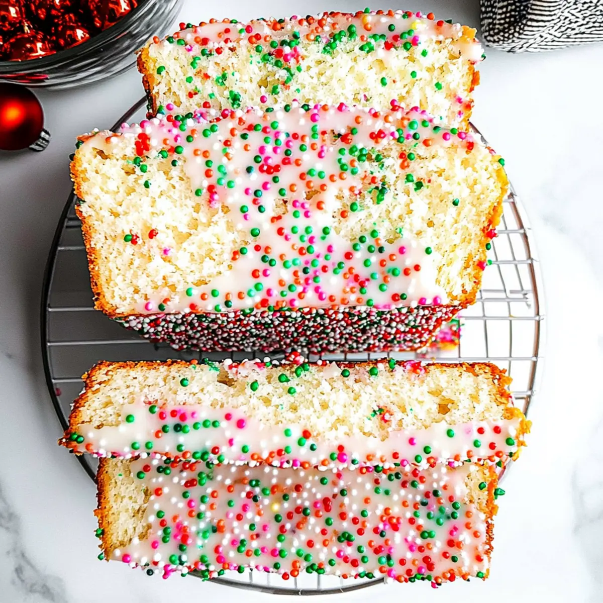 10. Drizzle the glaze over the cooled bread and garnish with nonpareils.