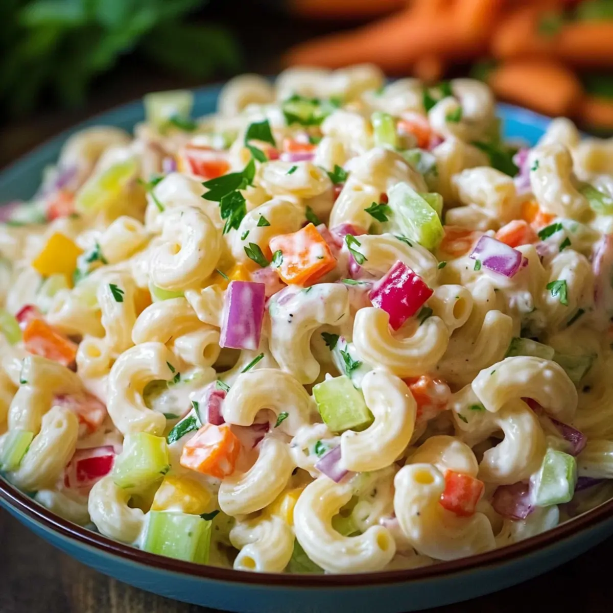 - In a large mixing bowl, combine the cooled macaroni, chopped eggs, diced bell pepper, carrots, celery, red onion, and parsley. Gently fold the ingredients together.