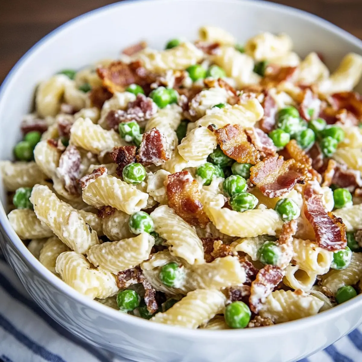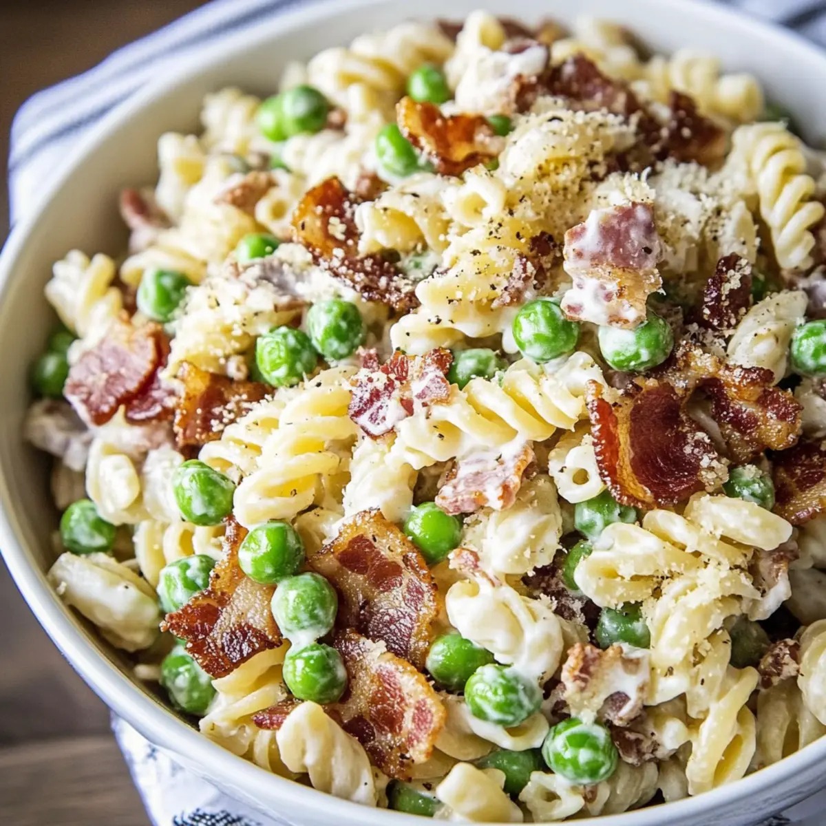 - In a large mixing bowl, combine cooled pasta, peas, chopped bacon, and Parmesan cheese. Pour dressing over and stir gently.