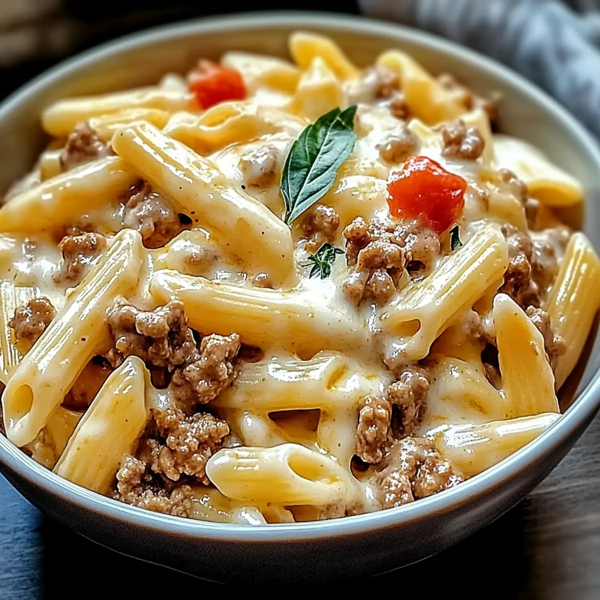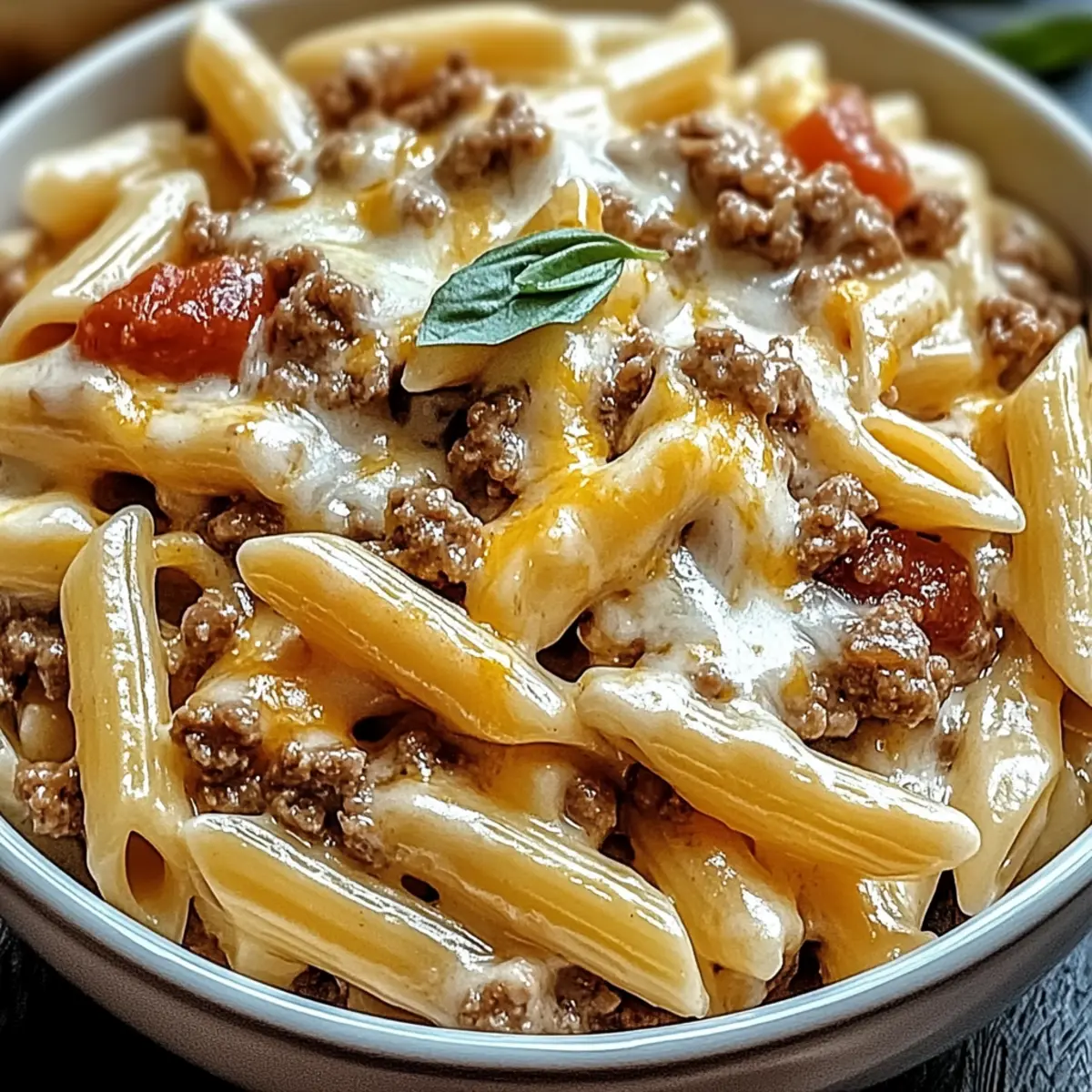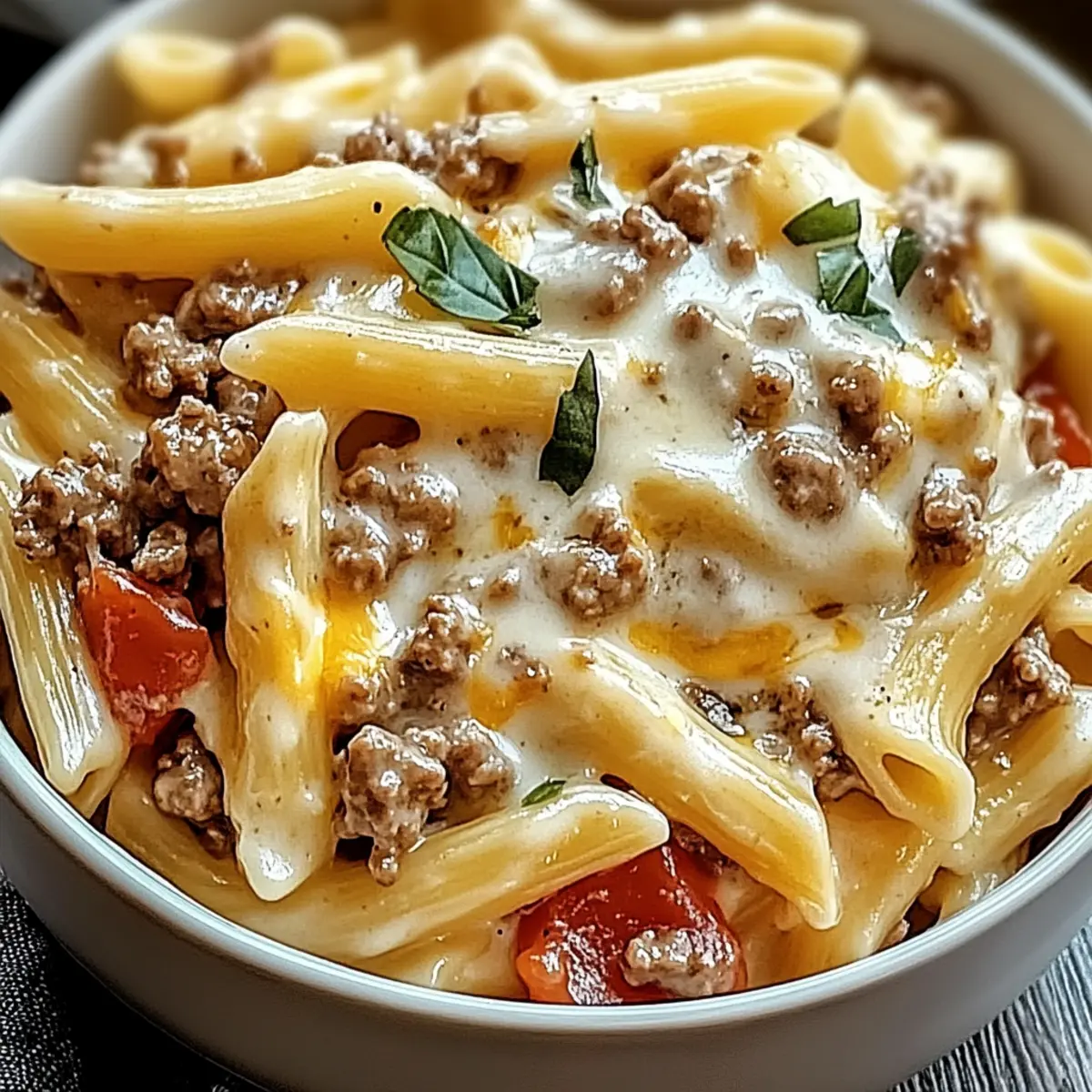 Comforting and Indulgent: Picture creamy, velvety pasta mingling with zesty tomatoes and savory beef—perfect for cozy nights at home.