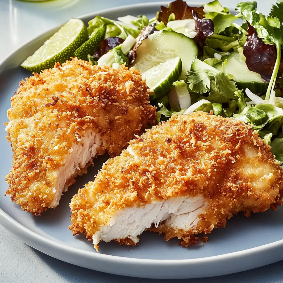 Once the chicken is cooked to golden perfection, remove it from the skillet and let it rest briefly on a paper towel-lined plate to absorb any excess oil. Plate the crispy chicken alongside the vibrant salad, drizzle the spicy mayo over the top, and garnish with lime wedges for an extra burst of freshness. Enjoy your homemade Crispy Crunchy Coconut Chicken with your loved ones!