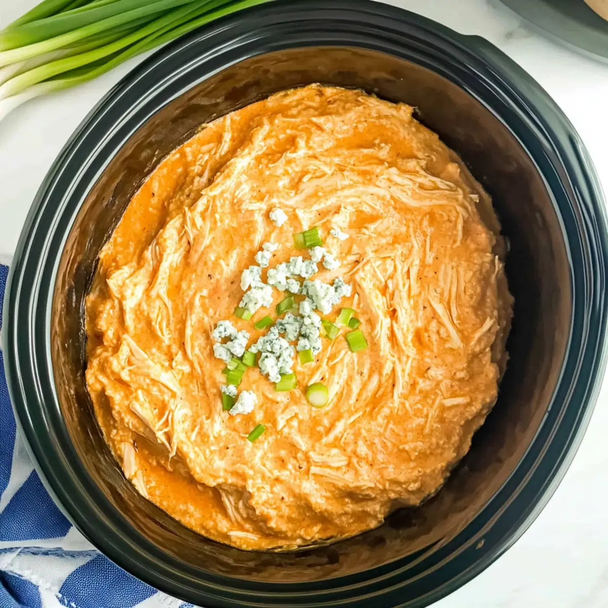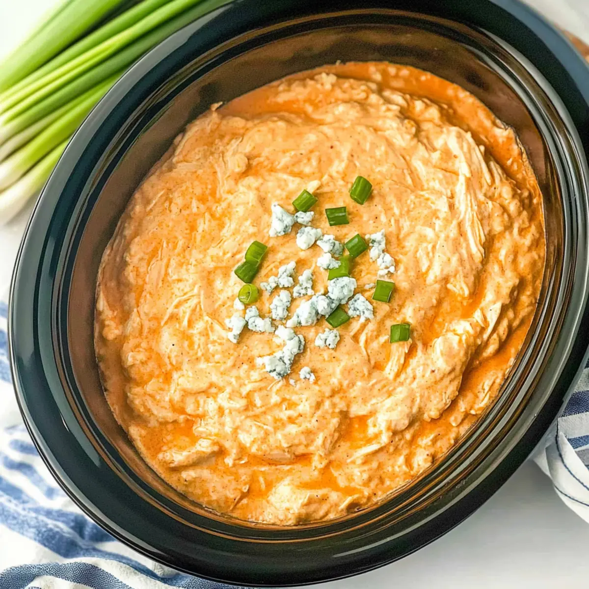 Once the cooking time is up, carefully uncover your crockpot. If you choose, sprinkle crumbled blue cheese and sliced scallions on top for an added burst of flavor and color. Serve the warm Crockpot Buffalo Chicken Dip directly from the crockpot with your favorite chips, veggies, or bread for dipping.