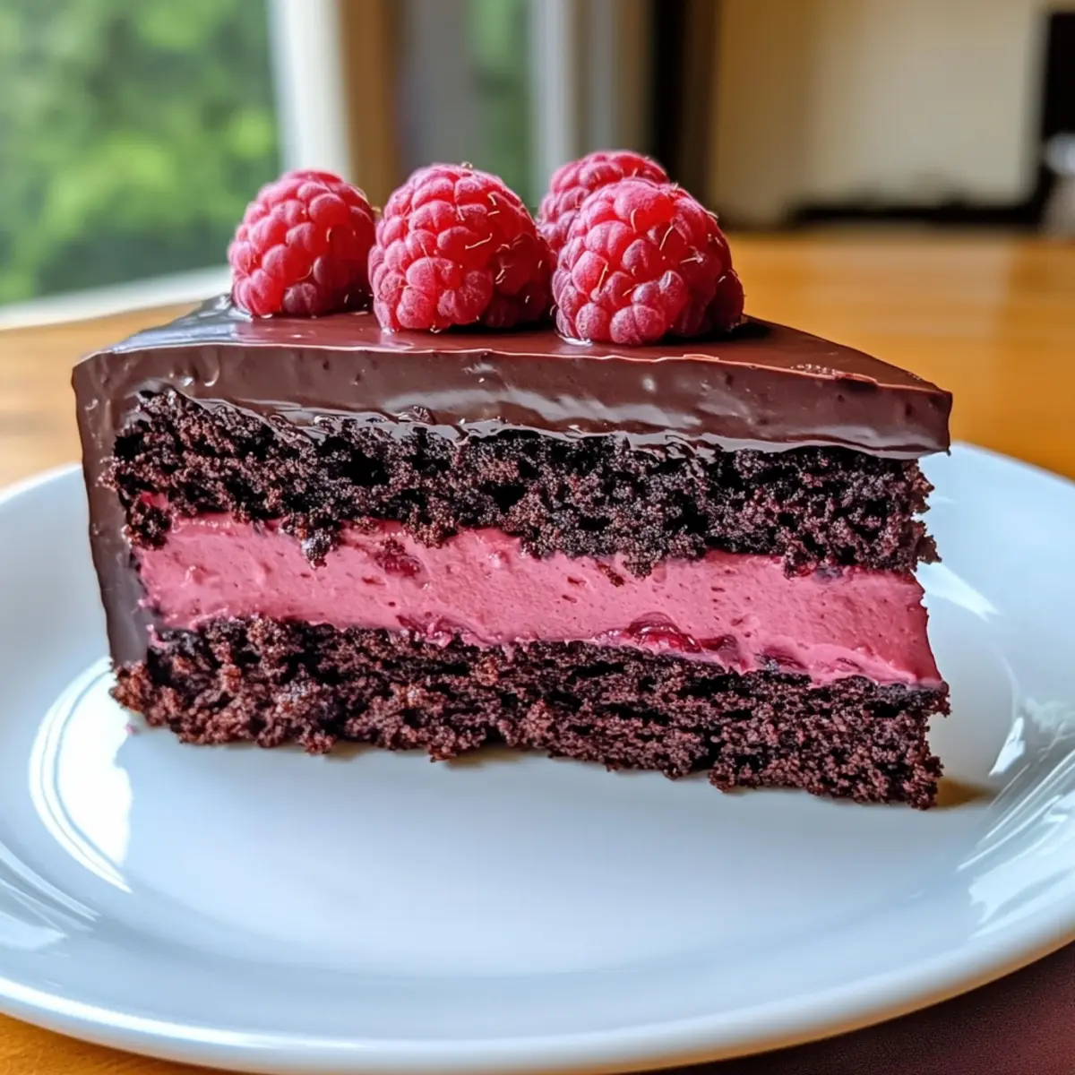 Once the ganache is ready, drizzle it over the chilled cake, allowing it to cascade beautifully down the sides. For an elegant presentation, serve sliced pieces alongside fresh raspberries or whipped cream. Your indulgent Dark Chocolate Raspberry Mousse Cake is now ready to impress!
