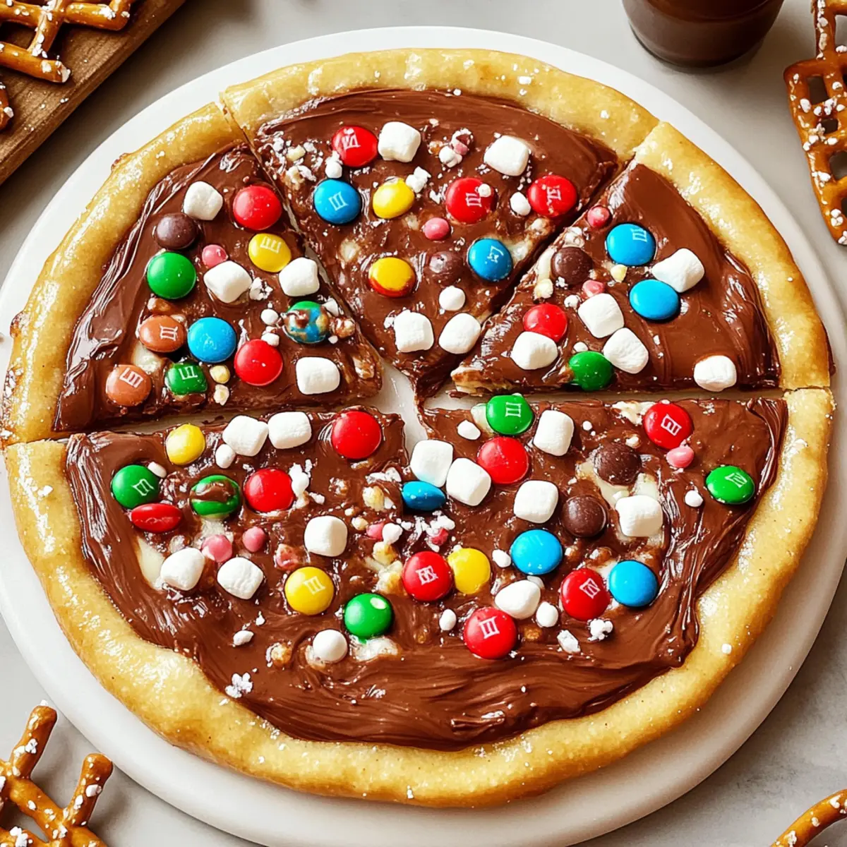 Sprinkle mini marshmallows, M&Ms, and chopped pretzels evenly across the Nutella layer. Get creative with your arrangement! Each topping adds its own unique flavor and texture, making your pizza colorful and appealing to all ages.
