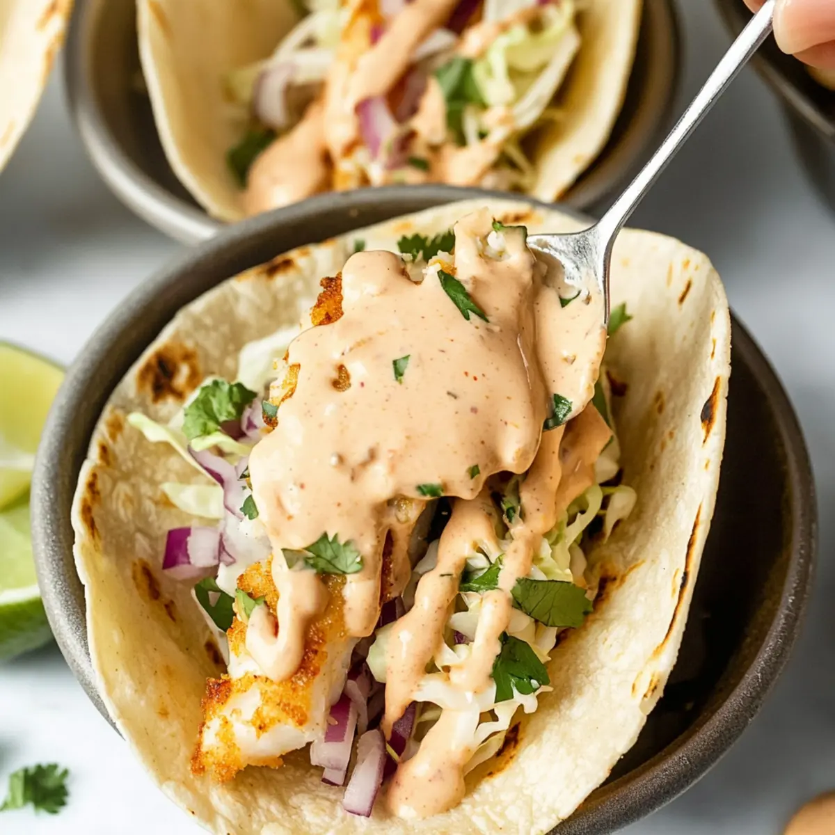 While the fish marinates, prepare the creamy taco sauce. In a separate bowl, mix mayonnaise, sour cream, an extra squeeze of lime juice, sriracha, garlic powder, smoked paprika, and a pinch of salt. Stir until smooth and well combined; taste and adjust seasoning as needed. Refrigerate the sauce to allow the flavors to meld while you continue with the tacos.