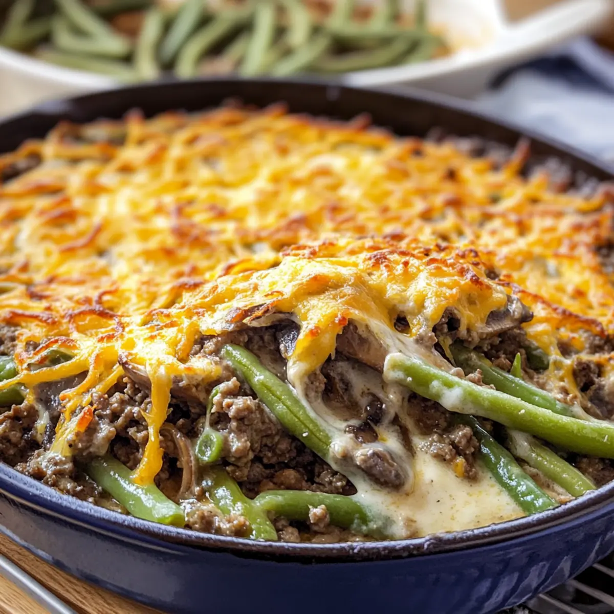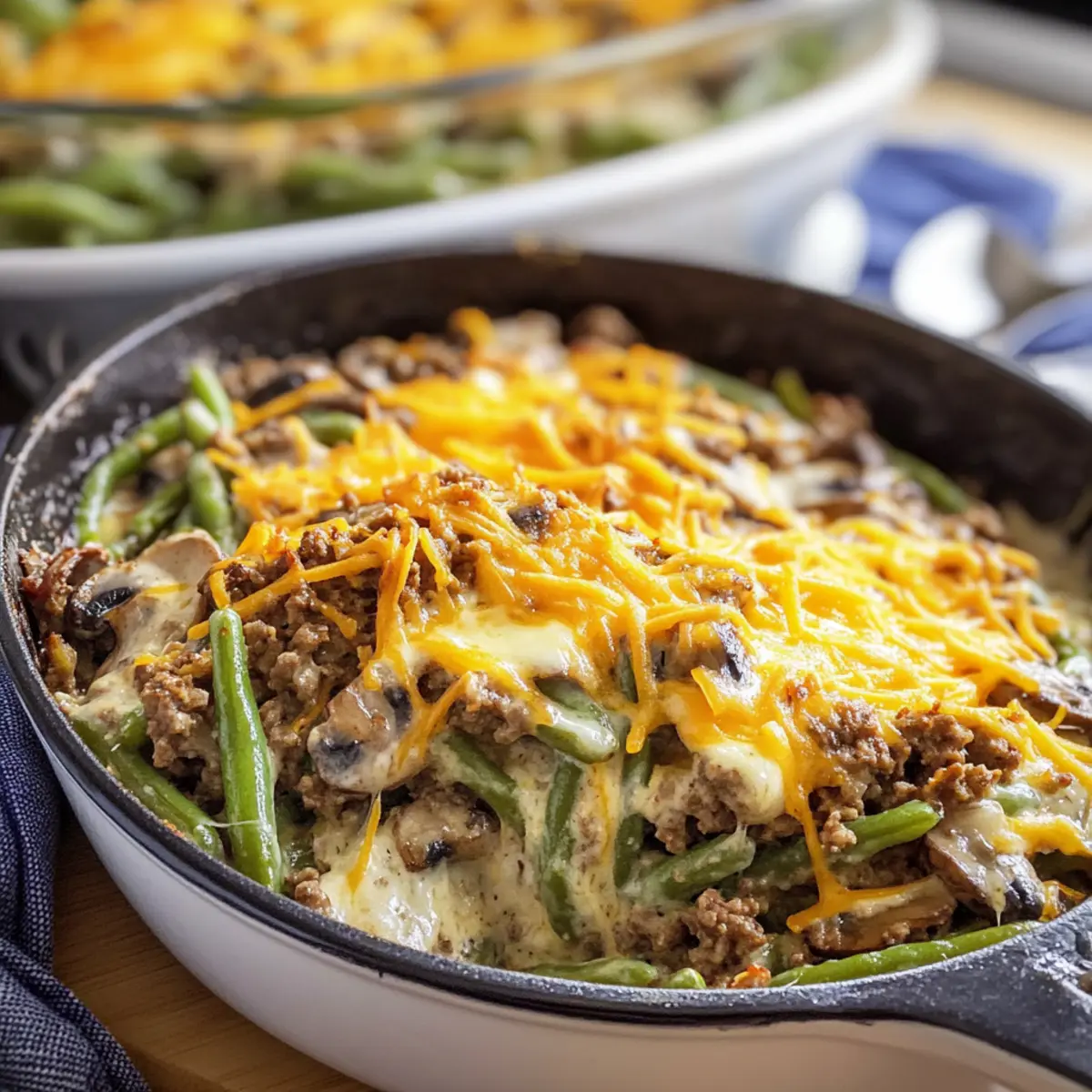 Broil the casserole on high for 1-2 minutes until the cheese is golden and bubbly. Alternatively, cover the skillet and cook on low heat for 3-4 minutes until the cheese has melted. Once it’s ready, serve hot, and enjoy this comforting Hamburger Green Bean Casserole with Mushrooms!