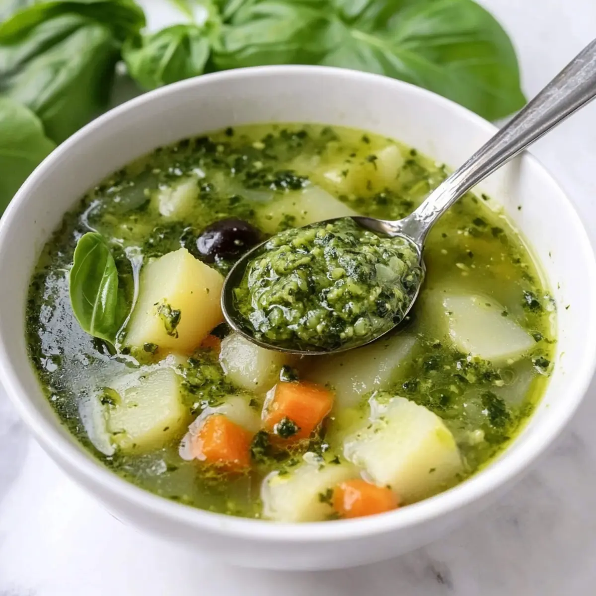 - Ladle the soup into bowls and top with a spoonful of pesto before serving.