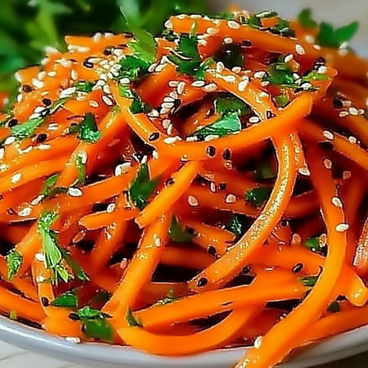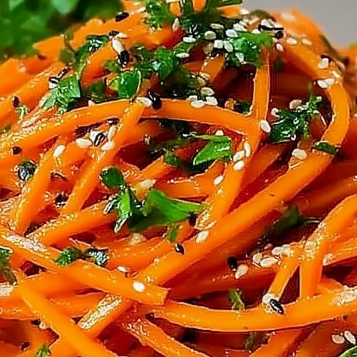 When ready to serve, take the salad out of the fridge and give it a good toss. Garnish with fresh parsley or cilantro to add a pop of color and freshness on top. Enjoy this vibrant Korean Carrot Salad as a refreshing side dish that brightens up any meal!