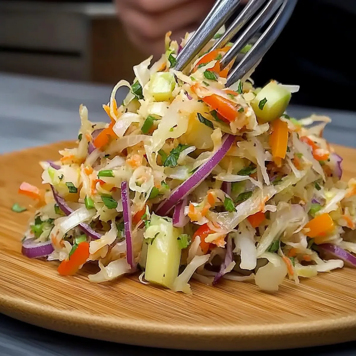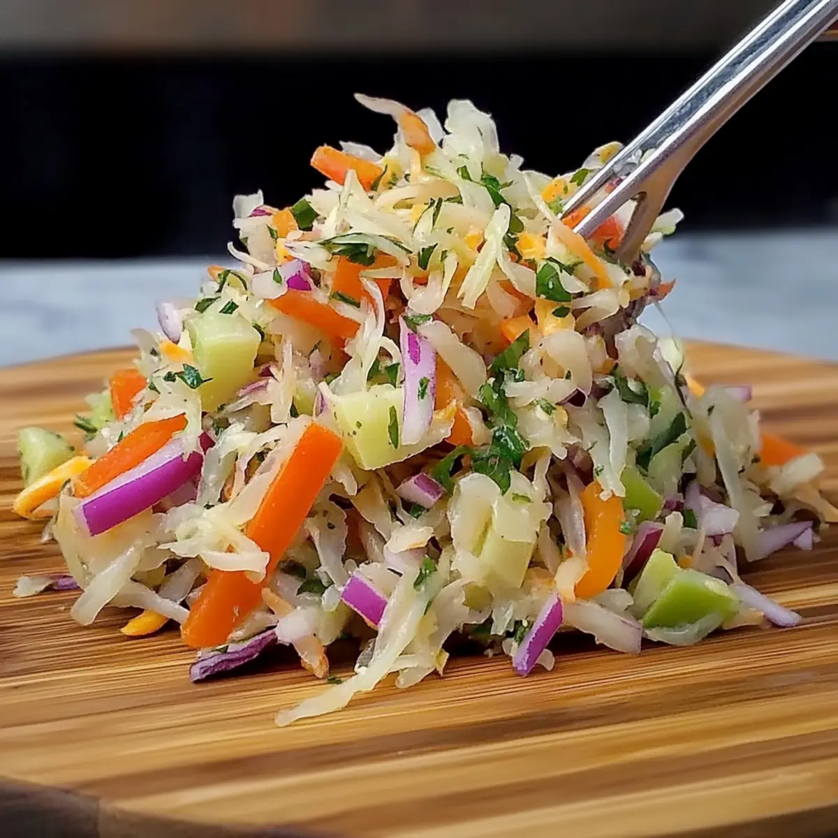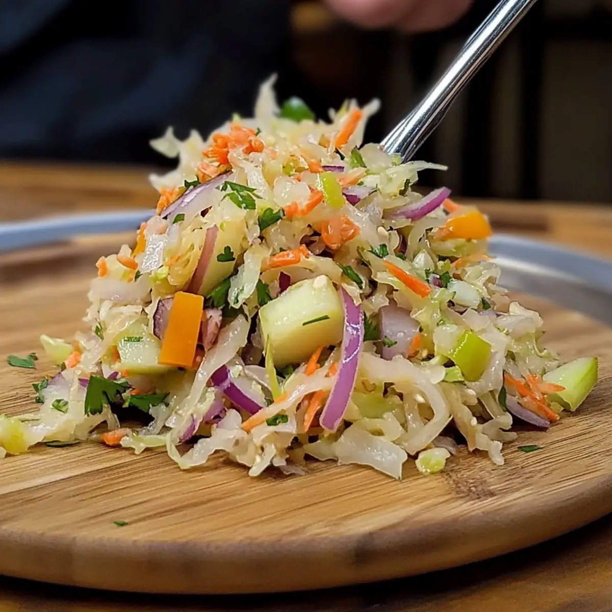 Healthful Crunch: Packed with vitamins and probiotics, this tangy salad isn’t just tasty; it’s nutritious too! It’s a great alternative to traditional coleslaw, offering health benefits without sacrificing flavor.