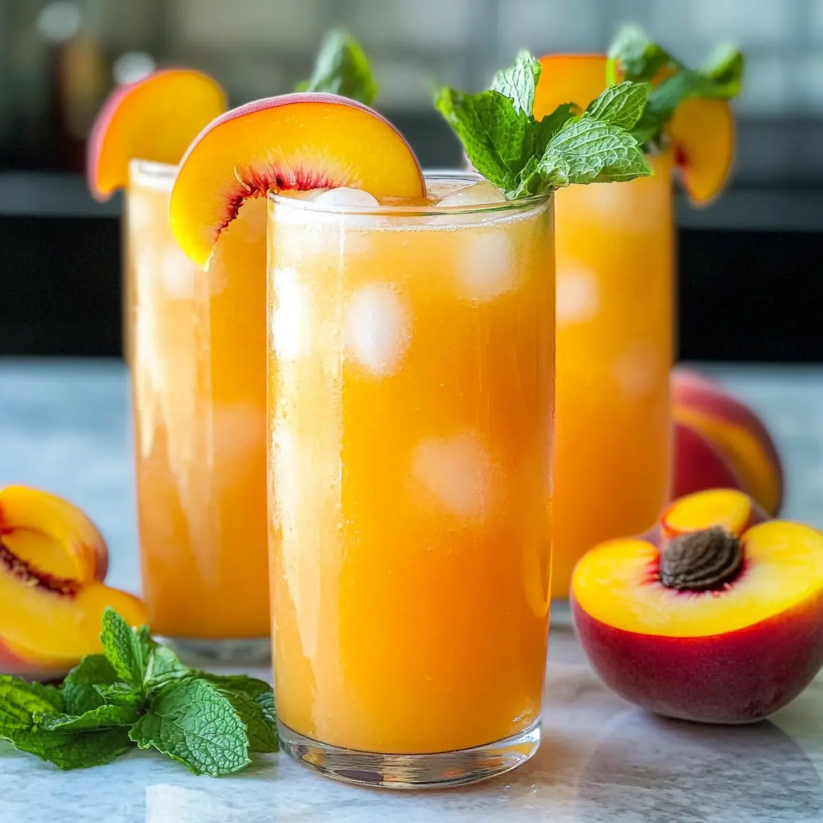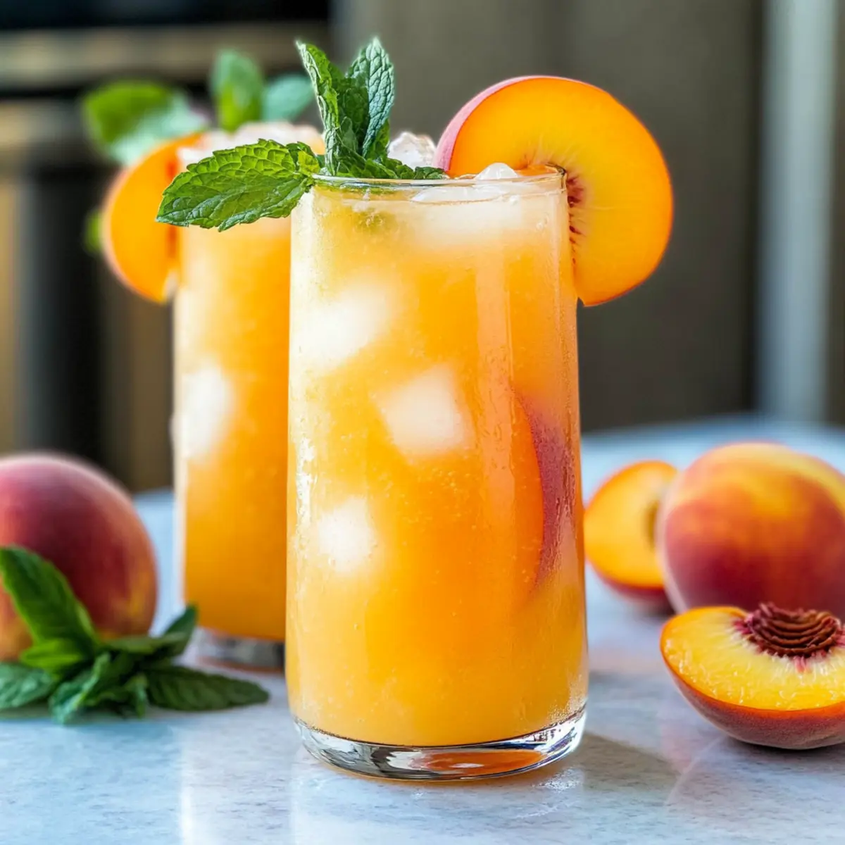 - Serve in tall glasses filled with ice, garnishing with mint leaves and peach slices.