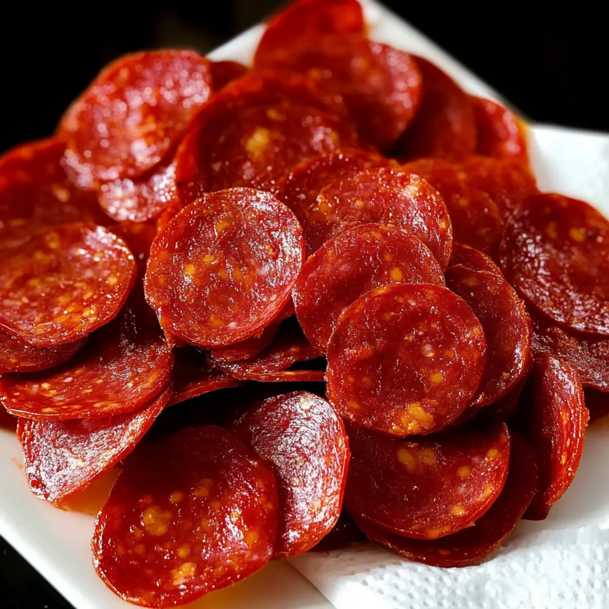 - After baking, carefully remove the pepperoni slices and gently blot with paper towels to absorb excess grease.