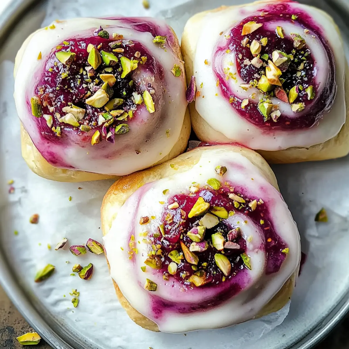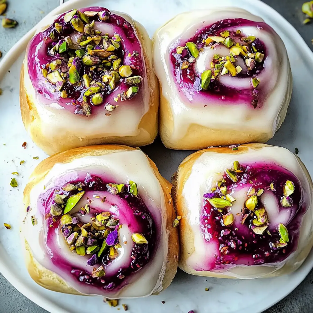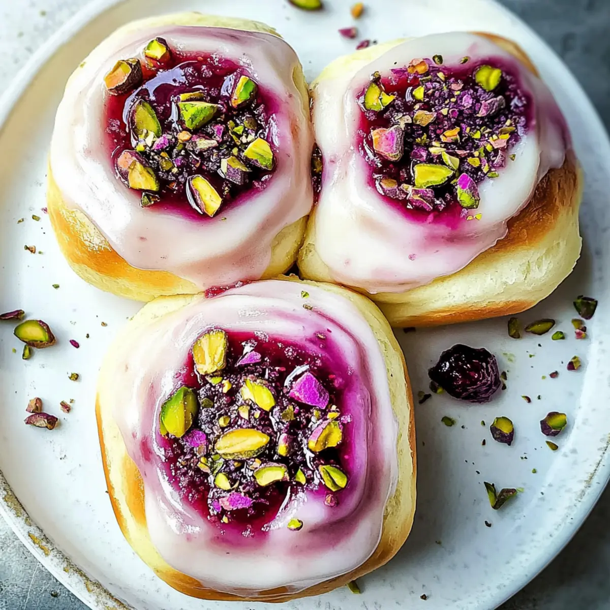 While the buns are baking, prepare the glaze by mixing icing sugar with fresh lemon juice and a hint of rose water until smooth. Once the buns are out of the oven and still warm, brush the glaze generously over each one. Finally, garnish with edible dried rose petals and chopped shelled pistachios for a beautiful finishing touch to your delightful Raspberry and Rose Cheesecake Buns.