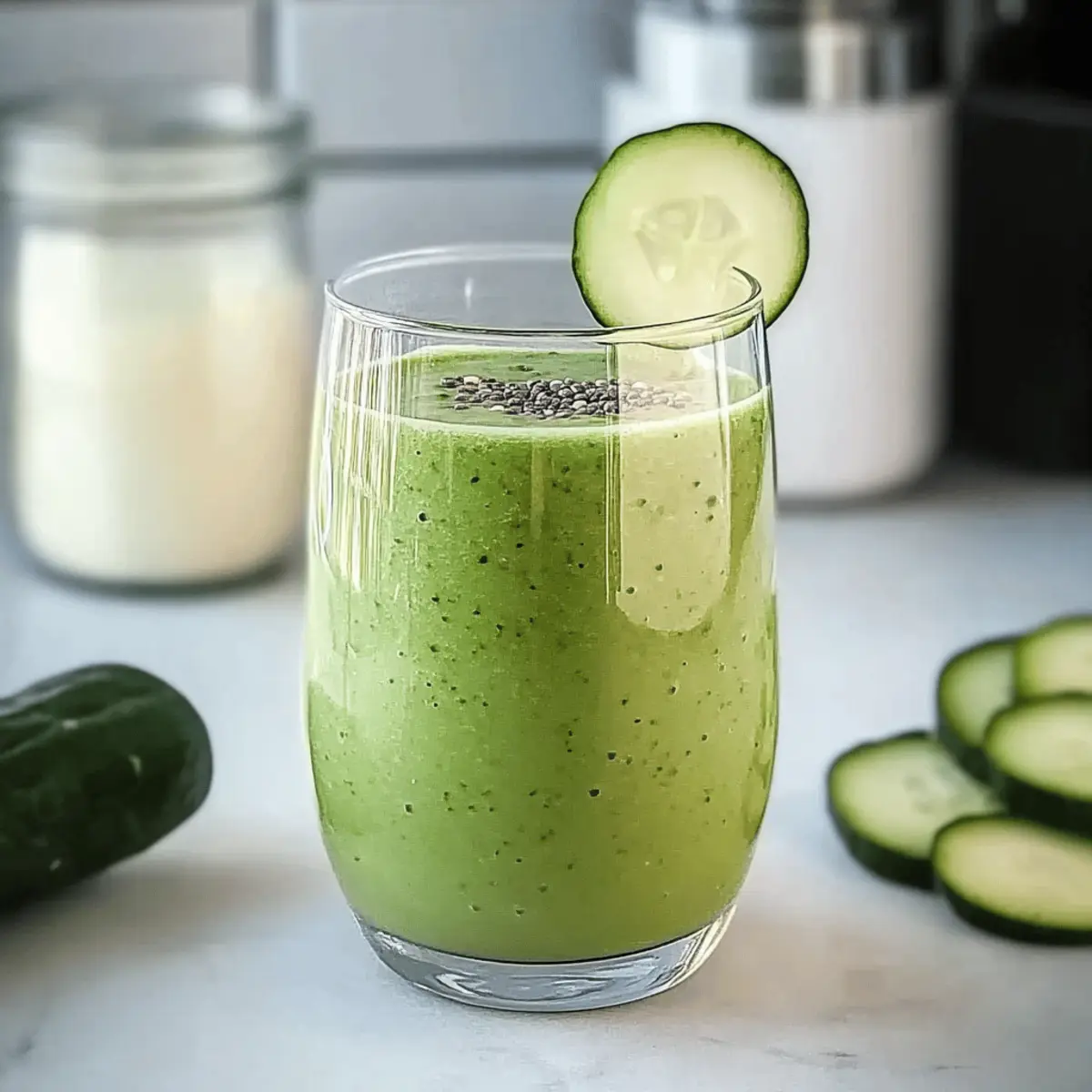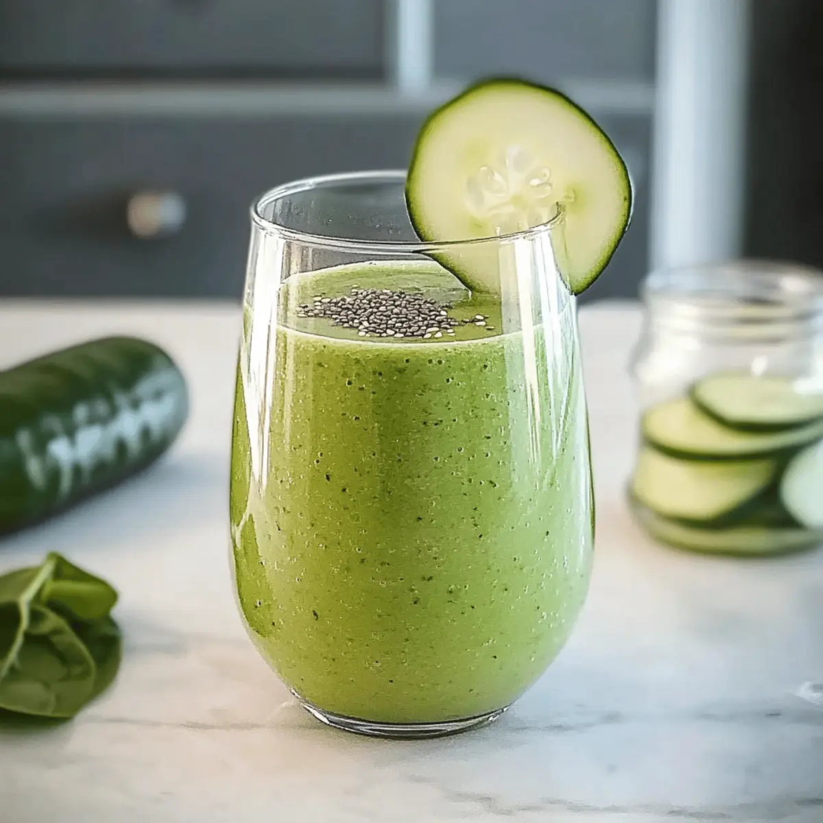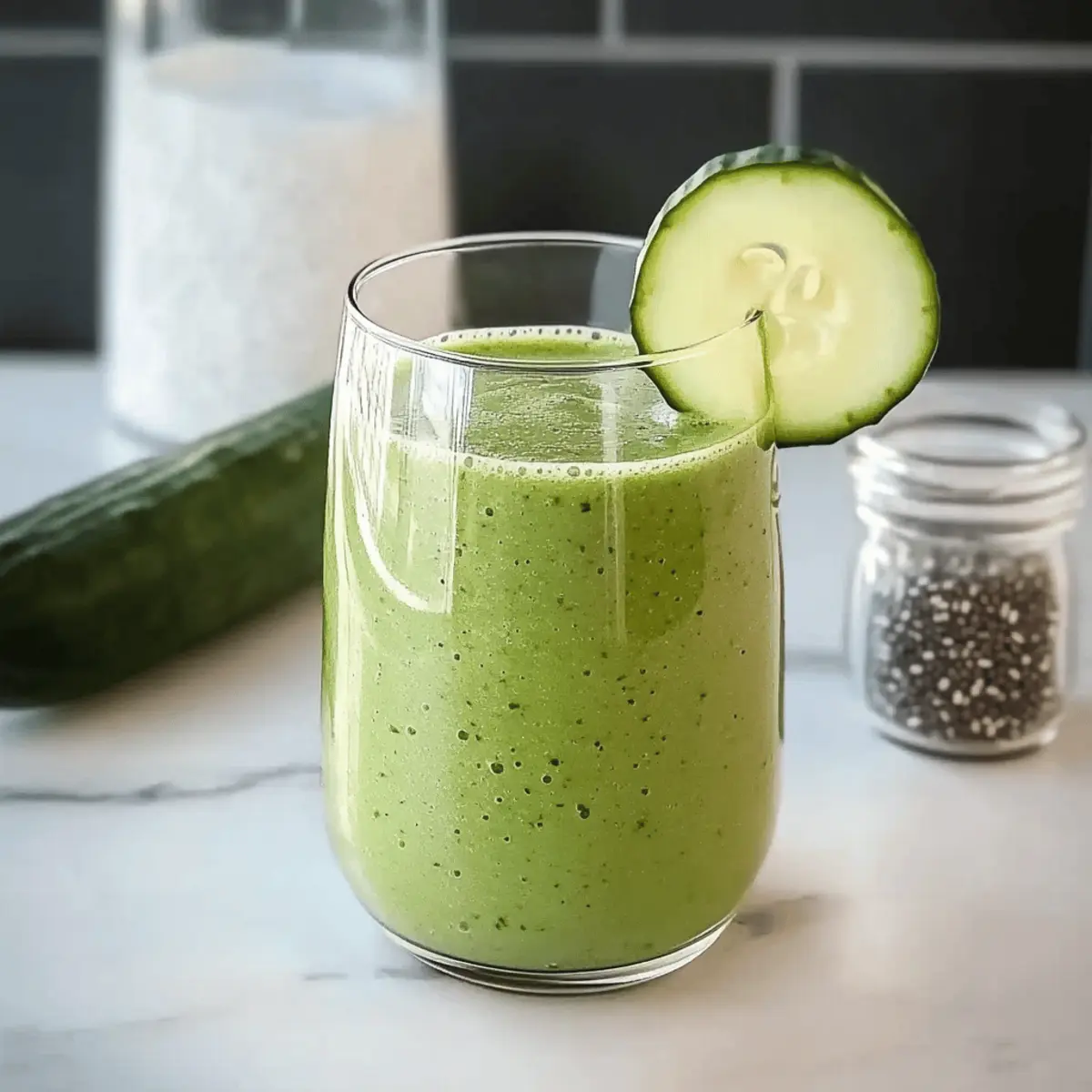 - Pour the smoothie into glasses, garnish with cucumber slices or chia seeds, and serve immediately.