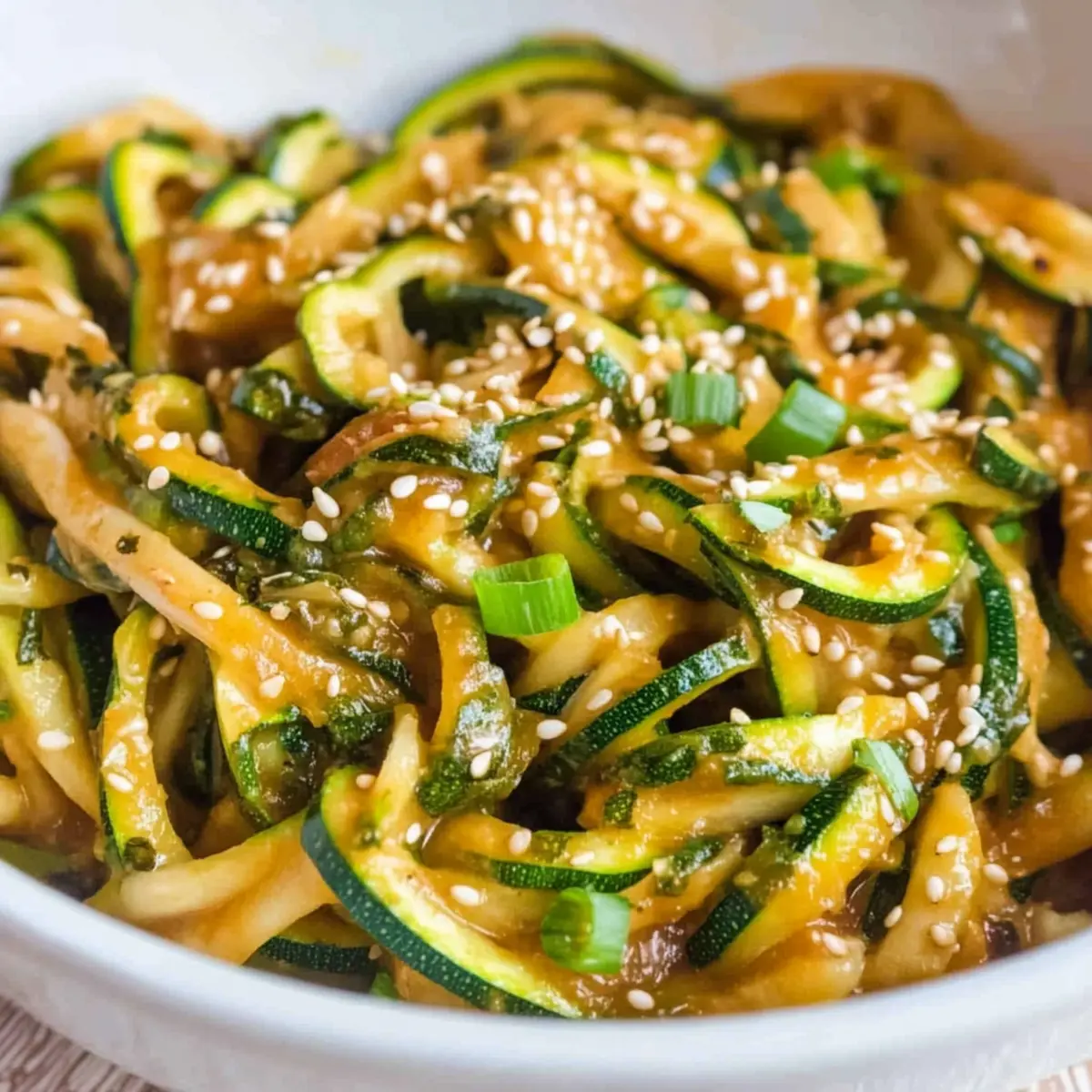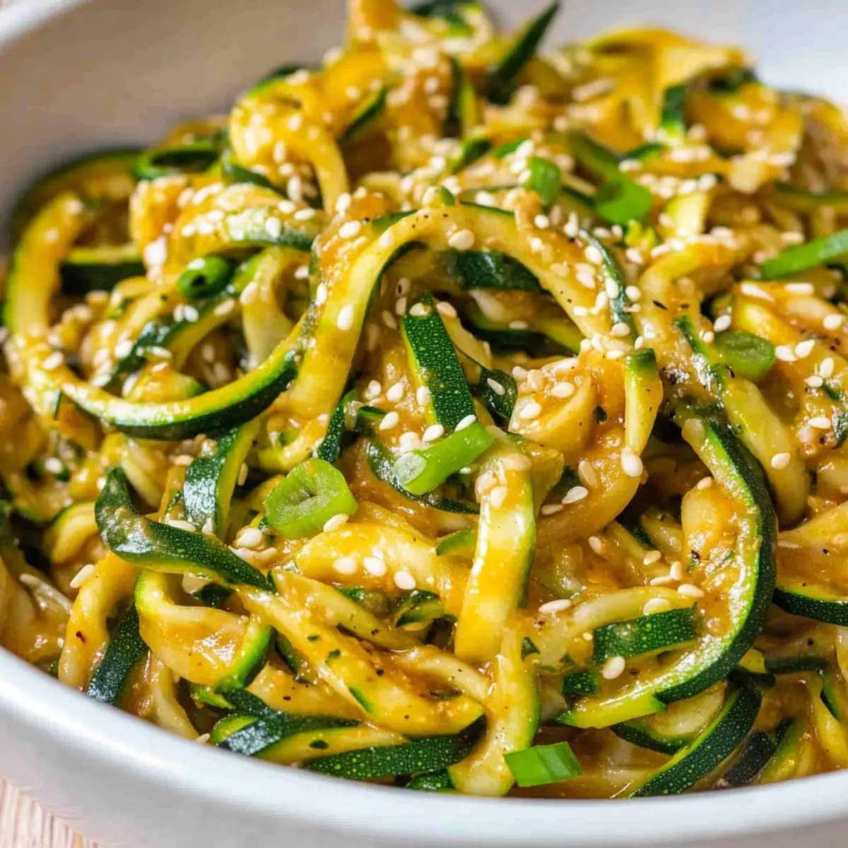 - Arrange zoodles on a serving plate and garnish with toasted sesame seeds and sliced green onions.