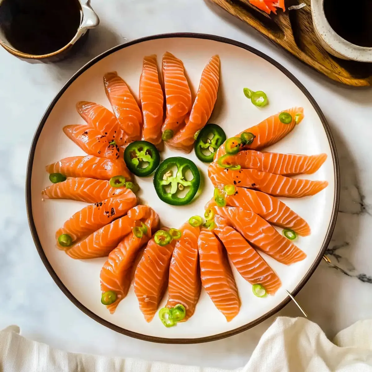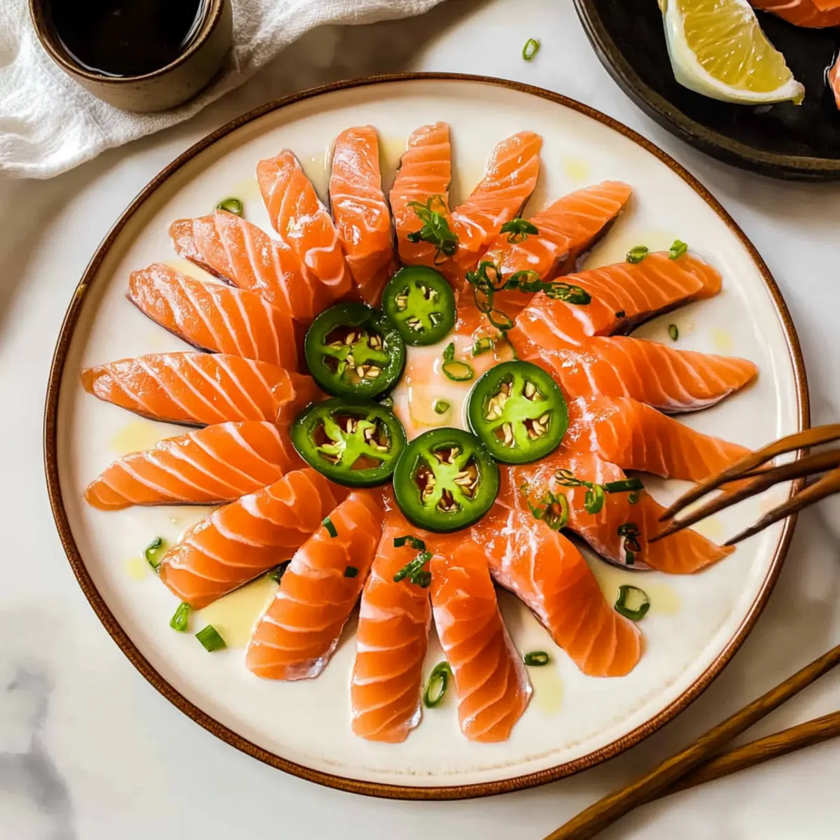 - Now, it’s time to plate your Spicy Salmon Sashimi! Begin by neatly arranging the salmon slices on your serving plate. Optionally, top each slice with a thin piece of jalapeño for an added spicy kick. Finally, drizzle the prepared sauce generously over the sashimi, ensuring each piece is well-coated for a burst of flavor with every bite. Enjoy immediately for the best experience!