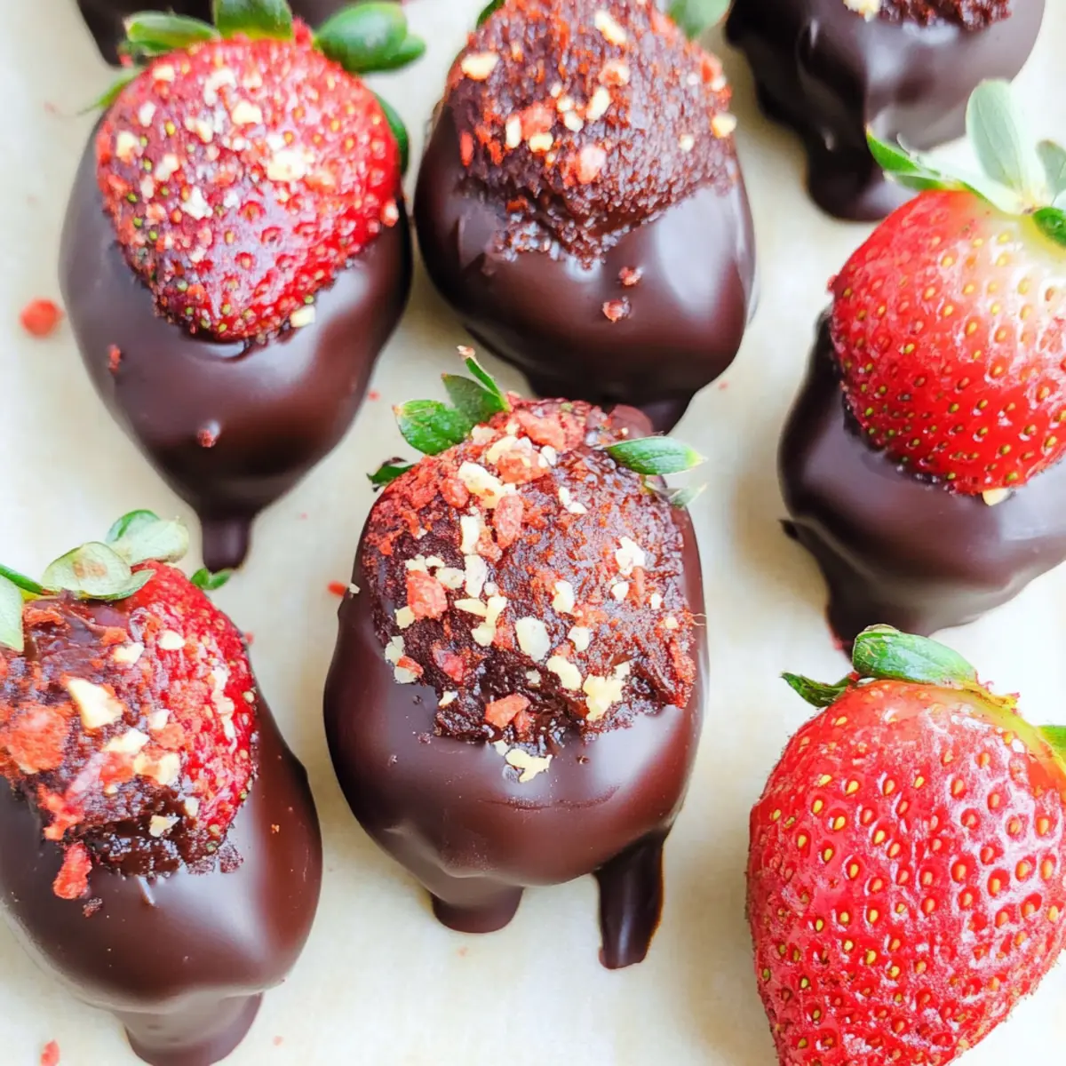 To add a touch of flair, sprinkle the tops of the dipped dates with the reserved crushed freeze-dried strawberries. Once all dates are decorated, refrigerate them for about 30 minutes, allowing the chocolate to harden completely. This final chill ensures a delightful crunch when you bite into these decadent treats.