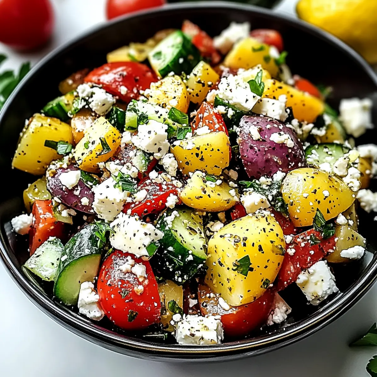 Gently add chopped fresh parsley, diced red onion, diced cucumber, sliced tomatoes, black olives, and crumbled feta cheese to the bowl of cubed potatoes. Gently fold the ingredients together, ensuring every piece is coated with the colorful array of fresh vegetables and creamy cheese.