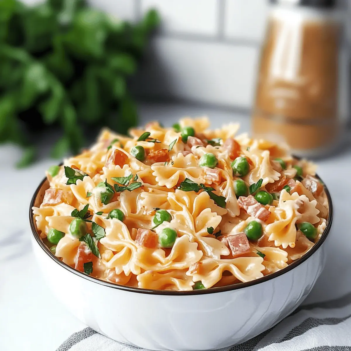 In a large mixing bowl, combine the cooled bowtie pasta with diced red onion, Canadian bacon, and frozen peas. Gently stir the mixture using a spatula or wooden spoon until the ingredients are evenly distributed. The combination of these components will create a delightful texture for your Zesty French Dressing Pasta Salad.
